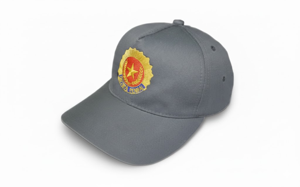 Boné modelo Americano (testa sem costura vertical), confecionado em brim médio ou microfibra, com regulador de plástico. Personalizado em silk até 4 cores.