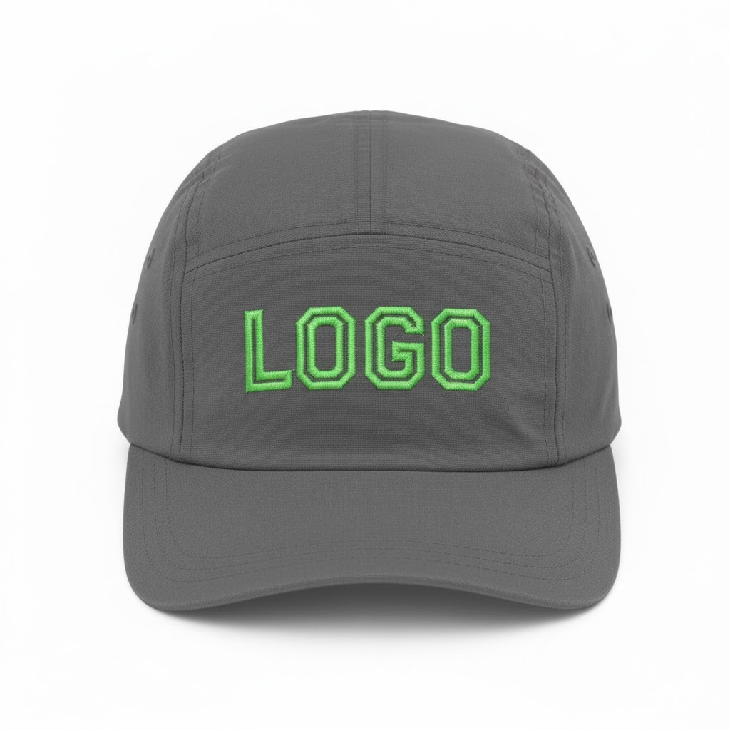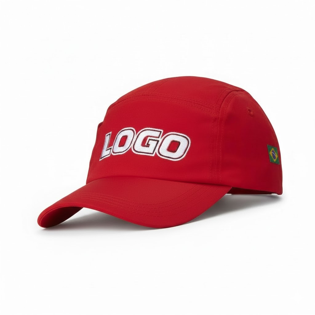 Boné modelo Ciclista (gomo frontal na testa), confecionado em brim médio ou microfibra, com regulador de plástico. Personalizado em silk até 4 cores.