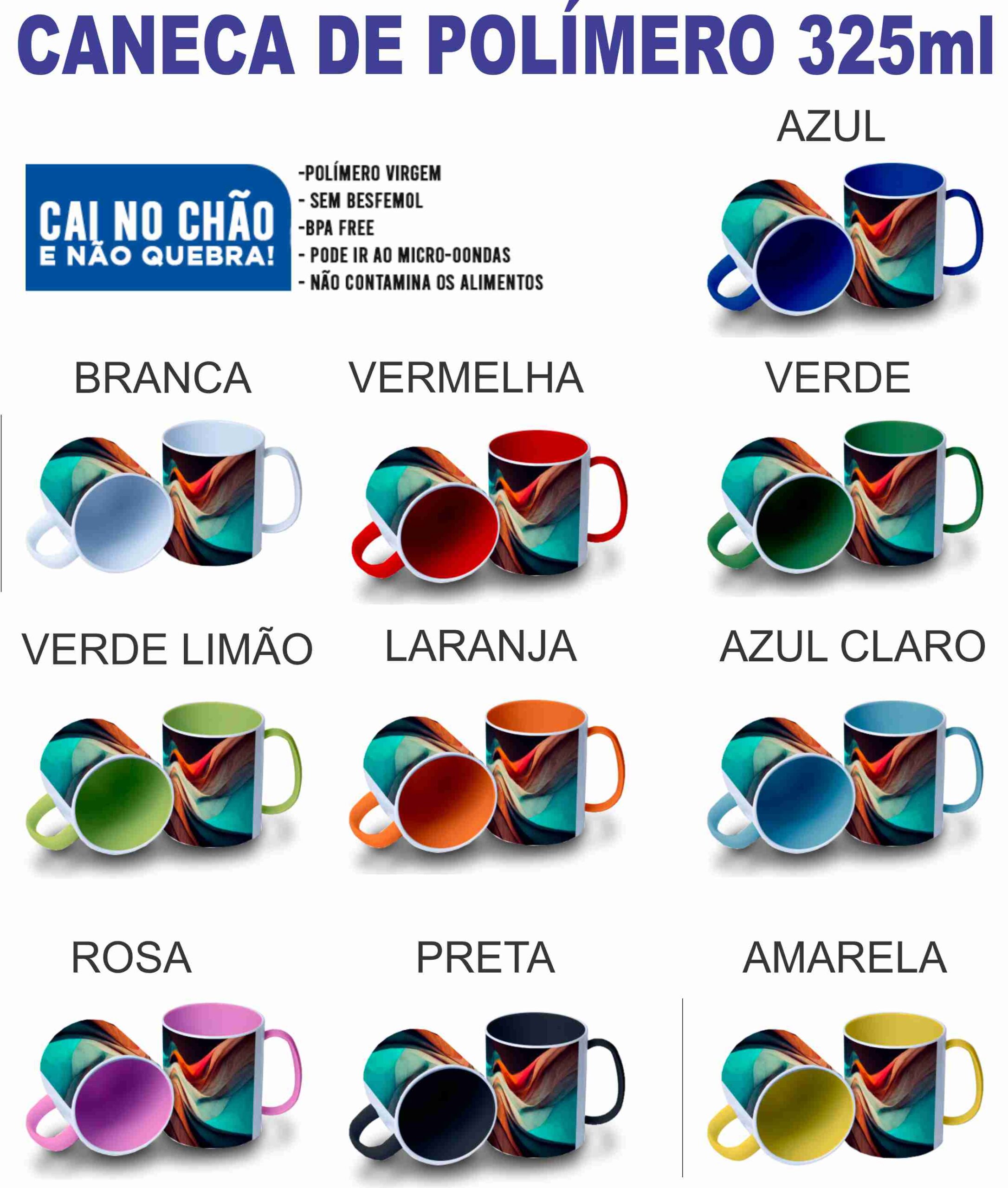 Caneca de Polímero de 325ml, personalizada. Resistende a quedas, sem besfemol, BPA Free, pode ir ao micro-ondas, não contamina os alimentos. Disponíveis em várias opções de cores.